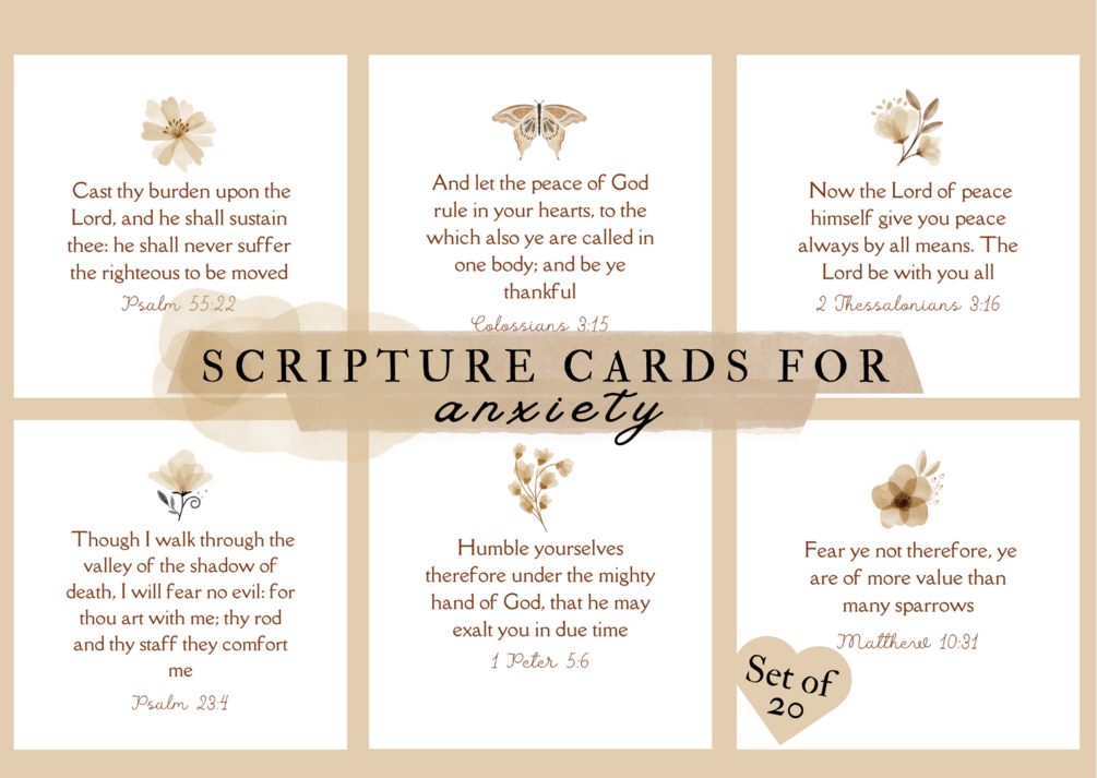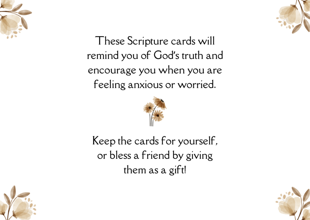 Introducing a set of 20 Scripture Cards For Anxiety, a powerful and uplifting product that will remind you of God’s truth and encourage you when you are feeling anxious or worried. Keep the cards for yourself, or bless a friend by giving them as a gift!