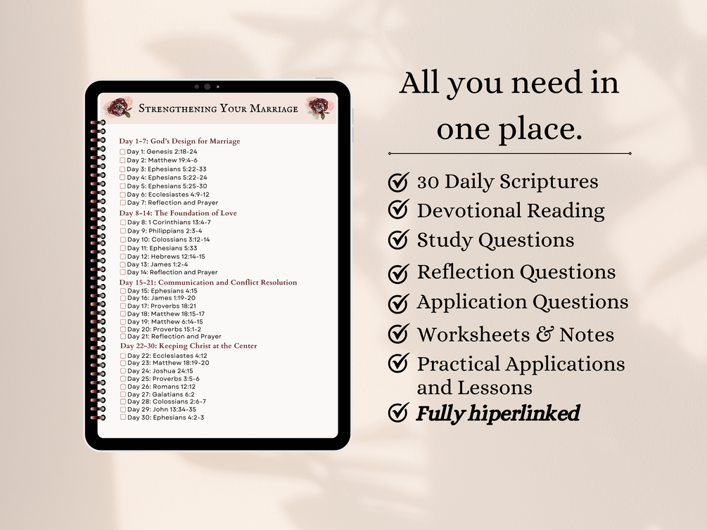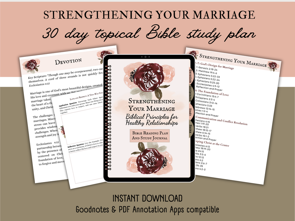 30-Day Bible Reading Plan - Strengthening Your Marriage - PDF file to upload into Goodnotes, Noteshelf, or other tablet read program, - PDF file to download and print at home.