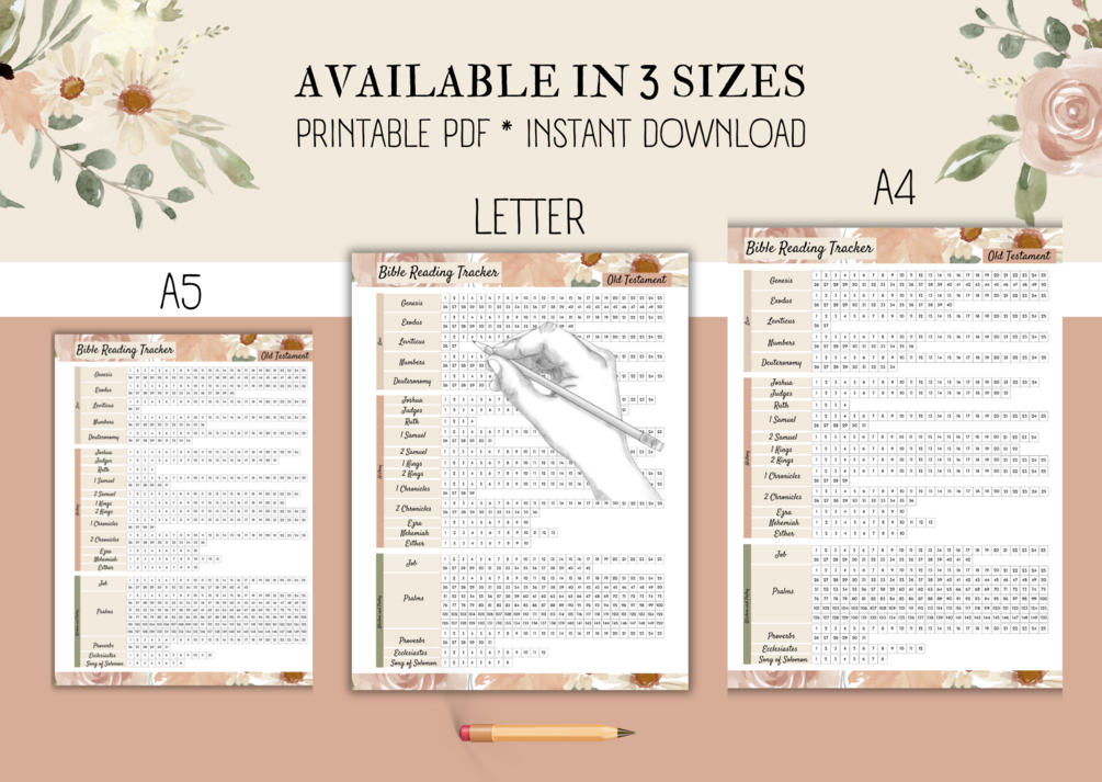 This printable includes 2 different styles of a Bible Reading Tracker in 3 sizes (US Letter, A4, and A5)